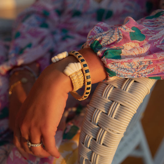 Inspired by the intricate art of Nantucket Lightship basket weaving, each bracelet is a masterful blend of tradition and style. Our bracelets are handcrafted in the US using rattan staves, dainty cane weavers, and specialty woods that exude that laidback island feel. It's like a little piece of Nantucket's basket-making history for your wrist.